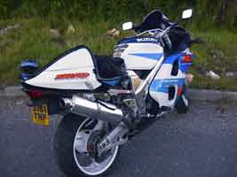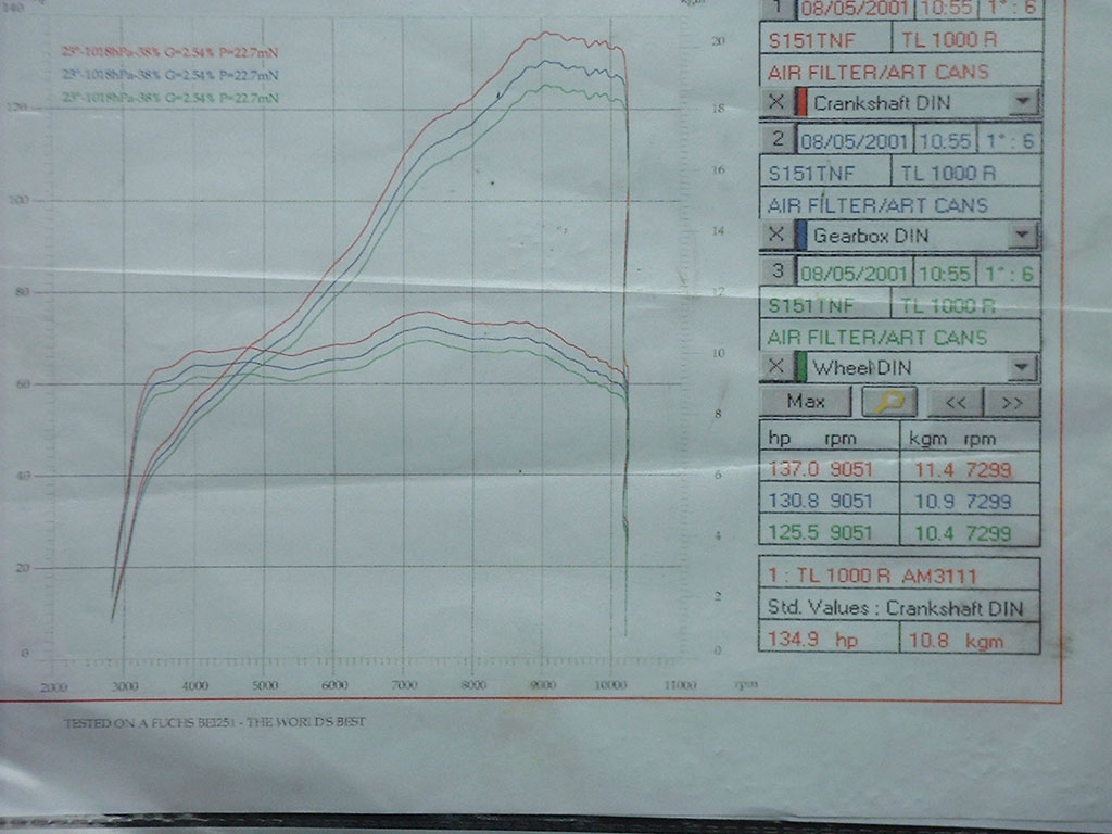 This is Bill's beast. He's had it a few years now and it would proberbly be easyier to list what mods he hasnt done to it. As you can see by the dyno graph, its pumping out some very nice horse's. He has turned this bike into a wheelie monster, it has that much low down grunt he can pick up the front wheel pretty much whatever gear he pleases. The crash pics at the bottom were taken a while ago after a slight mishap involving diesel on a roundabout, the bike has since been rebuilt and resprayed, pics to be posted shortly.